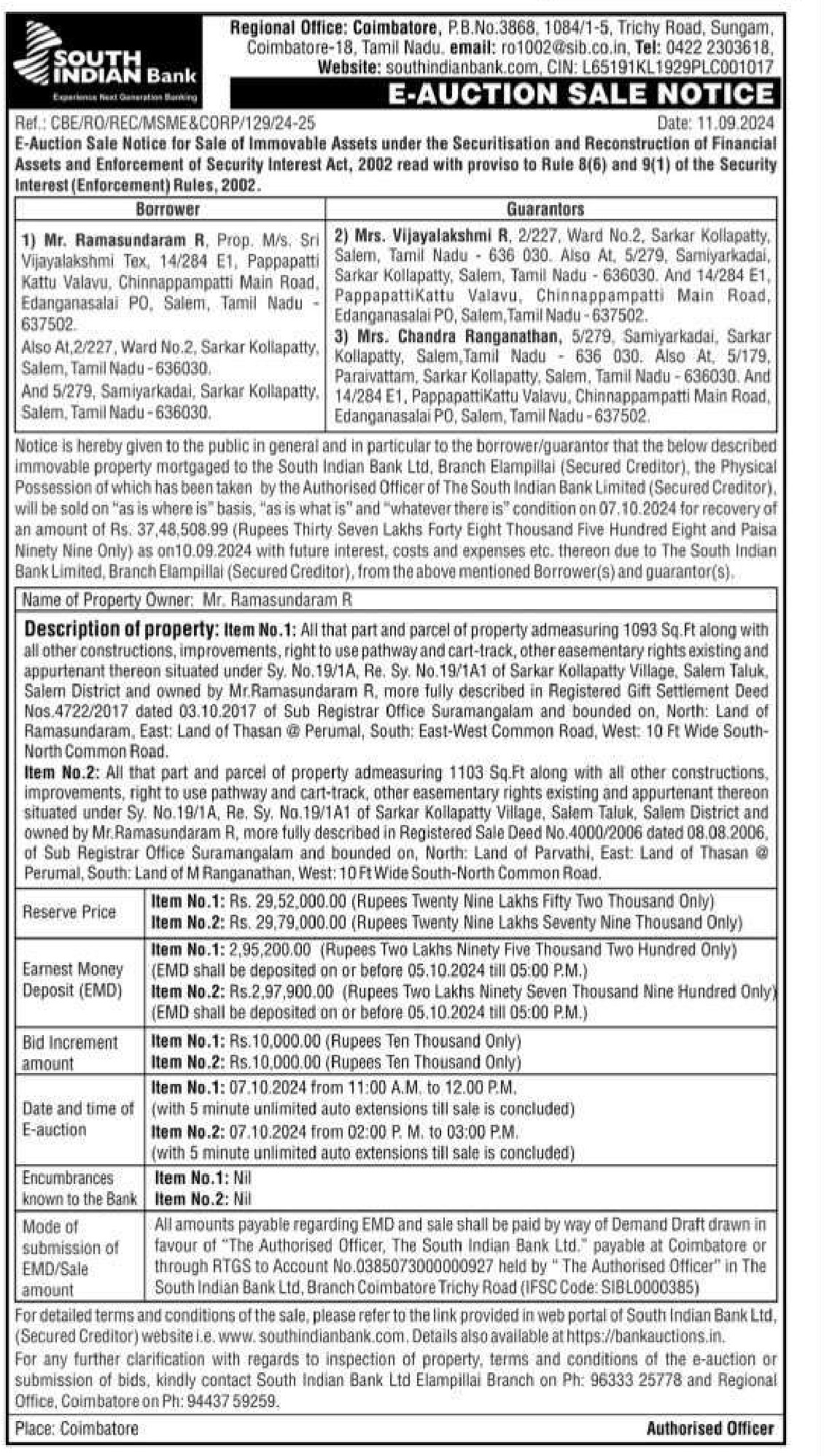 | Contact Details: | Contact The Authorized Officer : email: ro1002@sib.co.in. Tel: 0422 2303618,Ph: 96333 25778 , 9443759259. |