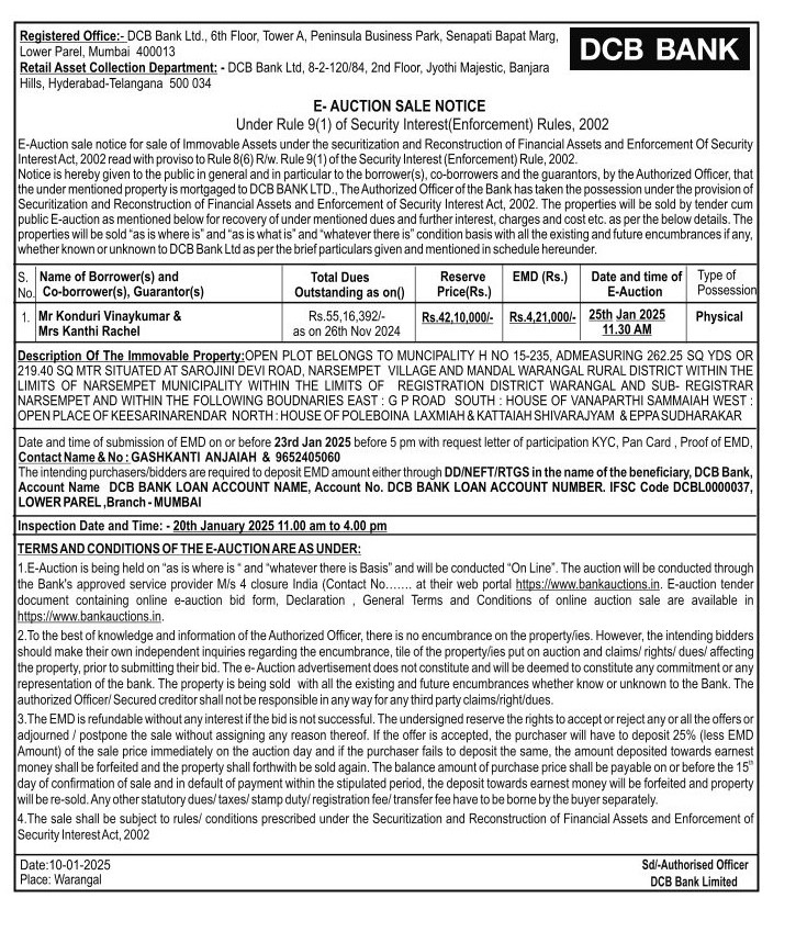 | Schedule of Property: | OPEN PLOT BELONGS TO MUNCIPALITY H NO 15-235, ADNEASYRUBG 262.25 SQ YDS OR 219.40 SQ MTE SITUATED AT SAROJINI DEVI ROAD, NARSEMPET VILLAGE AND MANDAL WARANGAL RURAL DISTRICT WITHIN THE LIMITS OF NARSEMPET MUNICIPALITY WITHIN THE LIMITS OF REGISTRATION DISTRICT WARANGAL AND SUB-REGISTRATION NARSEMPET AND WITHIN THE FOLLOWING BOUNDARIES EAST GP ROAD SOUTH HOUSE OF VANAPARTHI SAMMAIAH WEST OPEN PLACE OF KEESARINARENDAR NORTH HOUSE OF POLEBOINA LAXMIAH & KATTAIAH SHIVARAJYAM & EPPA SUDHARAKAR |