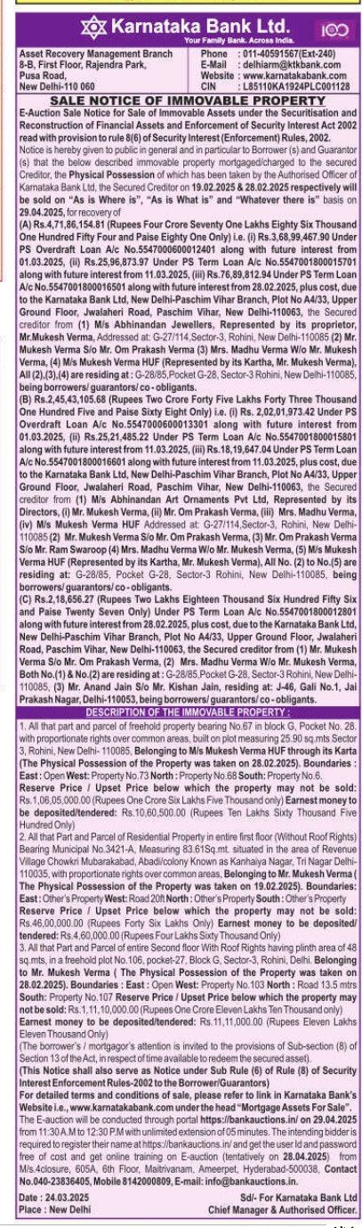 | Schedule of Property: | 1. All that part and parcel of freehold property bearing No 67 in block G. Pocket No 28. with proportionate rights over common areas built on plot measuring 25.90 sq. mts Sector 3. Rohini, New Delhi- 110085 Belonging to M/s Mukesh Verma HUF through its Karta (The Physical Possession of the Property was taken on 28.02.2025). Boundaries East Open West: Property No 73 North Property No 68 South: Property No 6. |