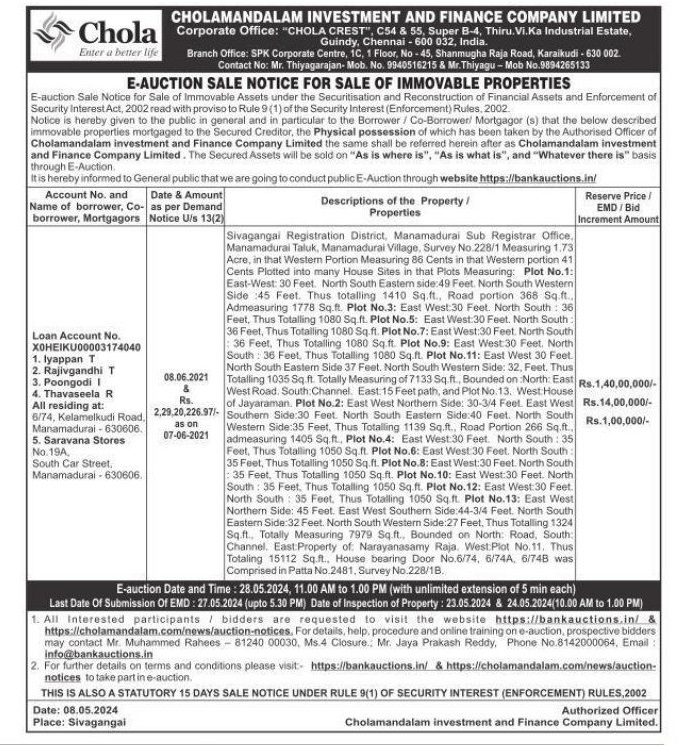 | Contact Details: | Contact The Authorized Officer: Mr. Thiyagarajan- Mob. No. 9940516215, Thiyagu Mob No.9894265133, Mr. Muhammed Rahees Ph No: 8124000030 |