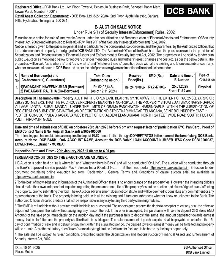 | Contact Details: | Contact The Authorized Officer: Anjaiah Gashkanti & 9652405060 |