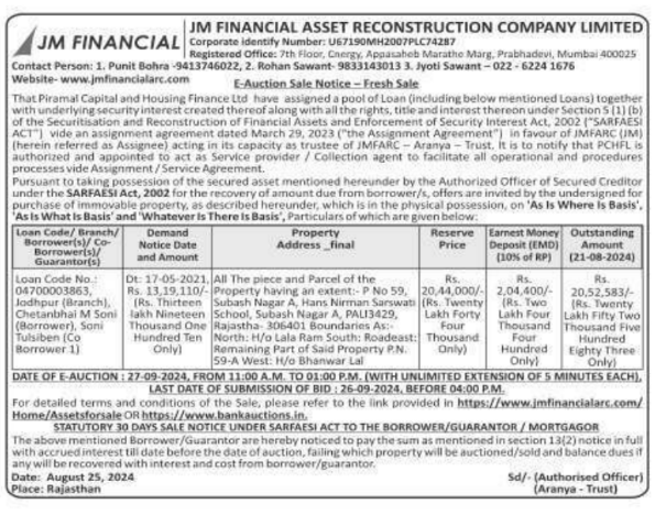 | Contact Details: | Contact The Authorized Officer: 1. Punit Bohra -9413746022, 2. Rohan Sawant-98331430133. Jyoti Sawant-022-6224 1676 Website-www.jmfinancialarc.com |