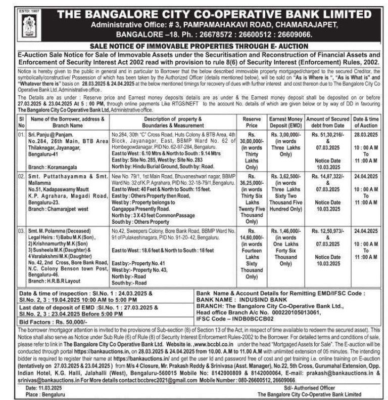 | Contact Details: | Contact The Authorized Officer: 080-26600512 , 26609066 |