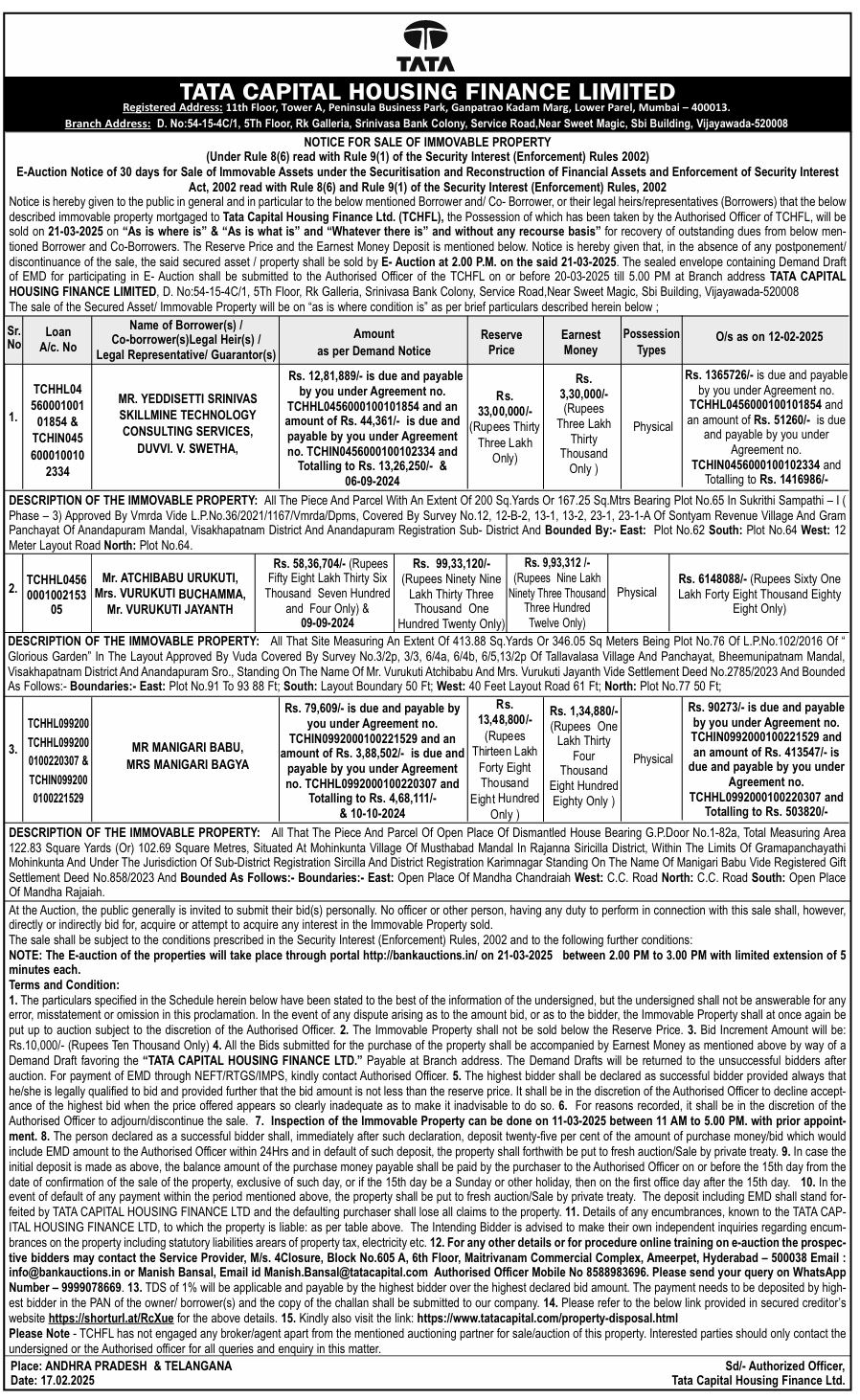 | Contact Details: | Contact The Authorized Officer: Manish Bansal, Email id Manish.Bansal@tatacapital.com 8588983696 / 9999078669 |