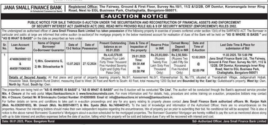 | Contact Details: | Contact The Authorized Officer : Mr. Ranjan Naik 6362951653, Mr. Umesh 8050149617, Mrs. Syeda 7400445147 |