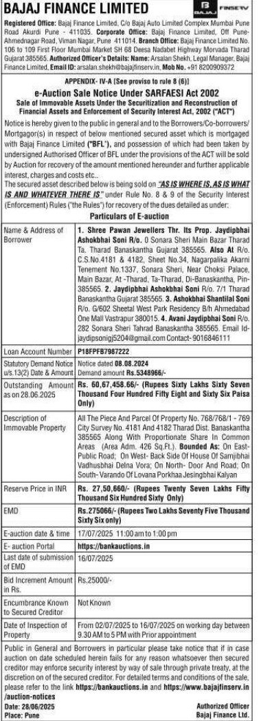 | Contact Details: | Contact The Authorized Officer: Arsalan Shekh, Email ID: arsalan.shekh@bajajfinserv.in, 91 8200909372 |