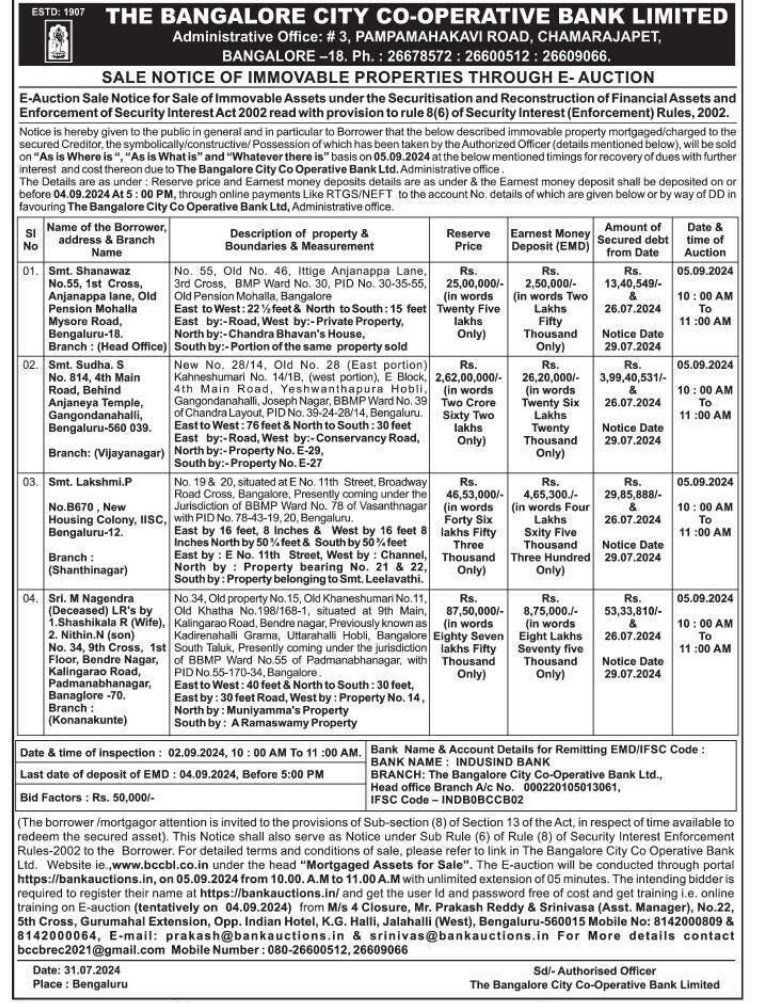 | Contact Details: | Contact The Authorized Officer : 080-26600512, 26609066 |