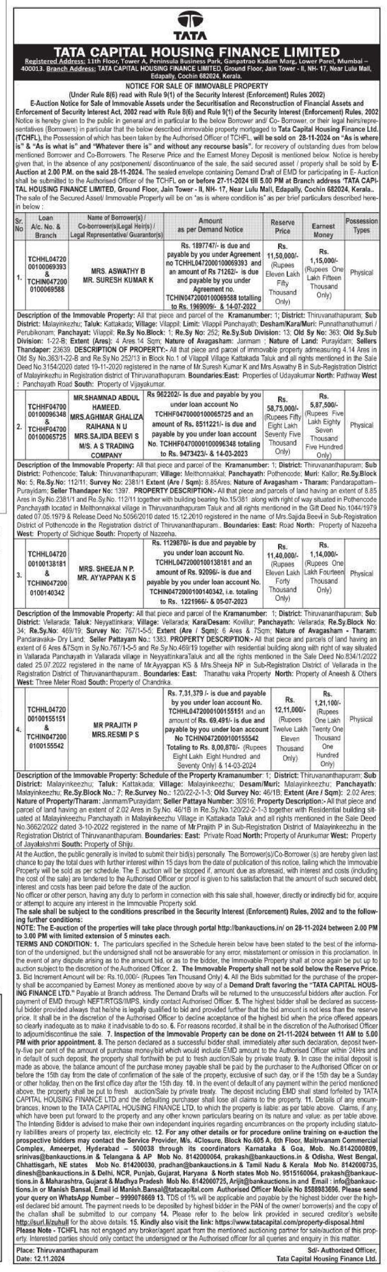 | Contact Details: | Contact The Authorized Officer: Mr. Manish Bansal - 8588983696 / 9999078669, Email: manish.bansal@tatacapital.com |