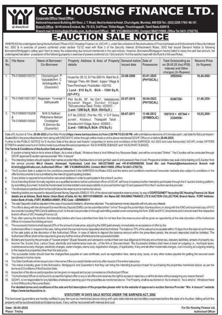 | Contact Details: | Contact The Authorized Officer: MR. V KUMARAGURU - 9843118900 , 0431-2762752 |