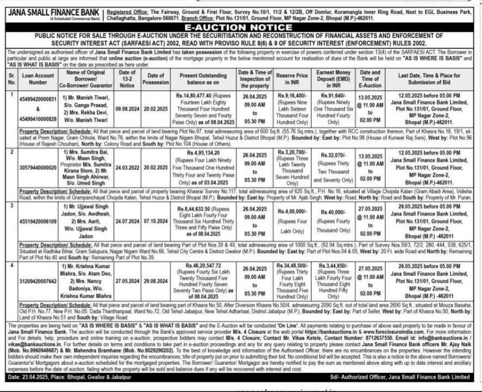 | Schedule of Property: | Property Description/ Schedule: All that piece and parcel of land beaning Part of Plot Nos 39 & 40, total admeasuring area of 1000 5qft, (92.94 5q mtrs), Part of Survey Nos 59/3, 72/2, 280, 444, 538, 625/1, Situated at Radhika Bihar, Gram Salupura, Nagar Nigam Ward No. 66. Tehsil City Centre & District Gwalior (MP) Bounded by: East by: Part of Plot Nos 04 & 05, West by: 20 Ft. wide Road and North by: Remaining Part of Plot No 40 and South by: Remaining Part of Plot No 39. |