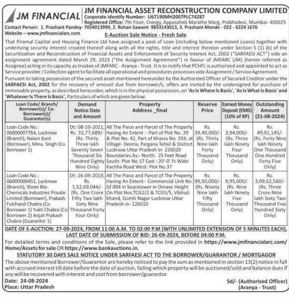 | Contact Details: | Contact The Authorized Officer: 1. Prashant Pandey-7054013999, 2. Rohan Sawant-9833143013, 3. Prashant Monde-022-6224 1676 Website-www.jmfinancialarc.com |