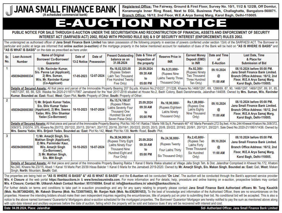 | Start Date and Time of Auction: | 09-10-2024 11:00 am |