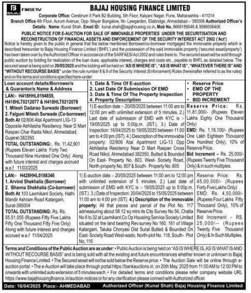 | Contact Details: | Contact The Authorized Officer: Kunal Shah. Email ID: kunal.shah@bajahousing.co in, Mob No. 8669189048 & 9586006406 |