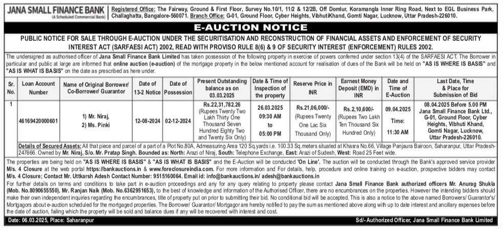 | Schedule of Property: | Details of Secured Assets: All that piece and parcel of a part of a Plot 80A. Admeasuring Area 120 Sq.yards i.e. 100.33 Sq.meters situated at Khasra No.66, Village Panjaura Bairoon, Saharanpur, Uttar Pradesh- 247666 Owned by Mr. Niraj, S/o. Mr. Pratap Singh. Bounded as: North: Arazi of Niraj, South: Telephone Exchange, East: Arazi of Sudesh, West: Road 25 Feet wide. |
