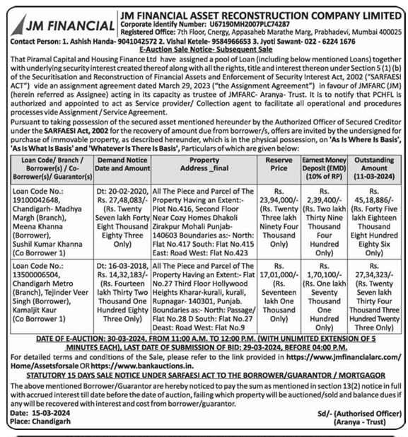 | Schedule of Property: | All The Plece and Parcel of The -Property Having an Extent:- Plot No.416, Second Floor Cy Near Cozy Homes Dhakoli Zirakpur Mohali Punjab- 140603 Boundaries as:- North: Flat No.417 South: Flat No.415 East: Road West: Flat No.423 |
