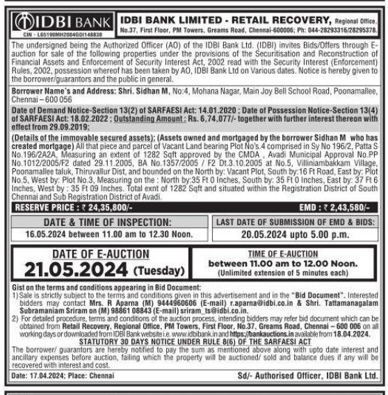 | Contact Details: | Contact Authorized Officer : Mrs. R Aparna Mob.No.:9444960606, Shri. Tattamangalam Subramaniam Sriram Mob. No.:9886108843 |