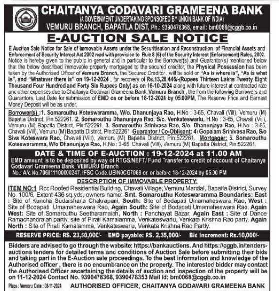 | Schedule of Property: | Item No: 1 Rcc Roofed Residential Building, Chavali Village, Vemuru Mandal, Bapatla District, Survey No 100 6, Extent 436 sq. yds, owners name: Smt Somarouthu Koteswaramma Boundaries East Site of Kuncha Sudarshana Chakrapani, South: Site of Bodapati Umamaheswara Rao, West : Site of Bodapati Umamaheswara Rao, Again South: Site of Bodapati Umamaheswara Rao, Again West: Site of Somarouthu Seetharamaiah, North : Panchayat Bazar, Again East : Site of Dande Ramachandraiah partly, site of Pirati Kamalamma, Venkateswarlu, Venkata Krishna Rao party. Again North Site of Pirati Kamalamma, Venkateswarlu, Venkata Krishna Rao Partly. |