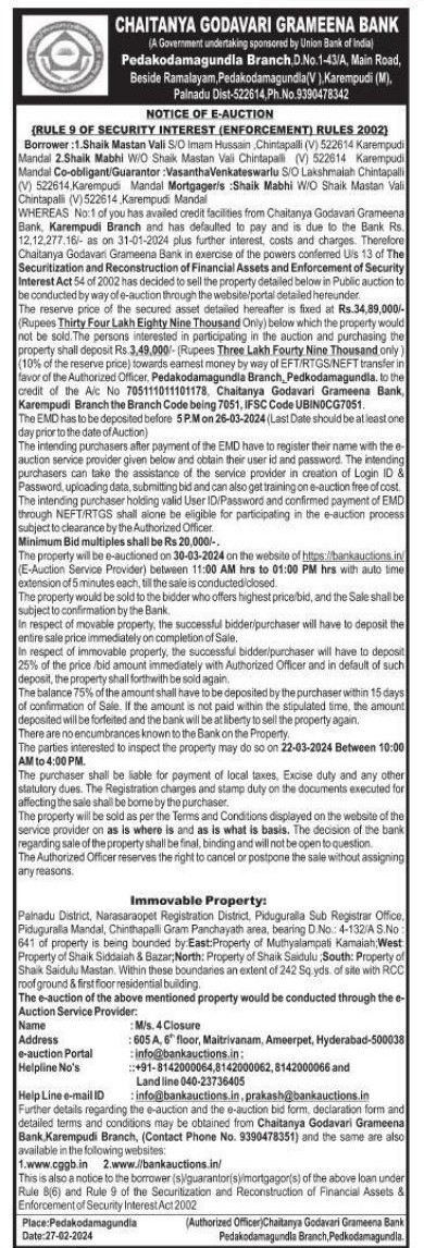 | Schedule of Property: | Palnadu District, Narasaraopet Registration District Piduguralla Sub Registrar Office, Piduguralia Mandal, Chinthapalli Gram Panchayath area bearing D No. 4-132/A S No 641 of property is being bounded by East: Property of Muthyalampati Kamaiah; West Property of Shaik Siddaiah and Bazar; North: Property of Shaik Saidulu South: Property of Shaik Saidulu Mastan Within these boundaries an extent of 242 Sq yds of site with RCC roof ground and first floor residential building |