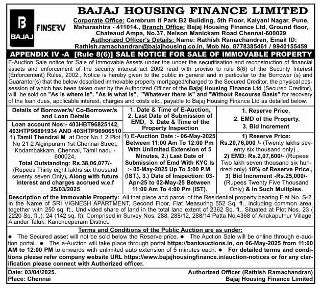 | Schedule of Property: | Description of the Immovable Property: All that piece and parcel of the Residential property bearing Flat No. S-2, in the Name of SRI VIGNESH APARTMENT, Second Floor, Flat Measuring 552 Sq. ft., including common area, together with 250 sq. ft., Undivided share of land in the total land extent of 2362 Sq. ft., Situated at Plot Nos. 23 ( 2220 Sq. ft.,), 24 (142 sq. ft), Comprised in Survey Nos. 288, 288/12, 288/14 Patta No.4368 of Anakaputhur Village, Alandur Taluk, Kancheepuram District |