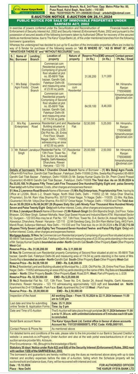 | Contact Details: | Contact The Authorized Officer : Mr.Himanshu Ranjan : 7765046680 Email : himanshuranjan@kvbmail.com |
