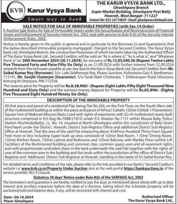 | Schedule of Property: | All that piece and parcel of a residential Flat, being Flat No 204, on the First Floor, on the South-West side of the multistoried building as within the piece and parcel of 4(Four) Cottahs 1(One) Chittak 17 (Seventeen) Square Feet of Mokorari Mourasi Bastu Land with rights of easements with (G+4) multistoried newly built structure comprised in R.S Dag No. 7088/21019, under R.S. Khaitan No.7131 within Mouza Bally, Police Station-Nischinda(Bally), J.L. No. 14, situated at North Ghoshpara within the Jurisdiction of Bally Gram Panchayet under the District Howrah, District Sub-Registry Office and additional District Sub-Registry Office at Howrah. That the area of the said Flat measuring about 434(Four Hundred Thirty Four) Square Feet more or less including Super built up area consisted of (One) Bed Room, 1 (One) Dining Room, (One) Kitchen Room, (One) Latrine and Bathroom and 1(One) Balcony with Marble Floor (within Lift Facilities) of the Multistoried Building and common stair, common space uses and all easement rights and with proportionate undivided share in the land underneath the said Flat together with the rights of user of the common area in the building and the lands within the jurisdiction of the office of District Sub Registrar and Additional District Sub Registrar at Howrah, standing in the name of Sri Saibal Kumar Roy. |