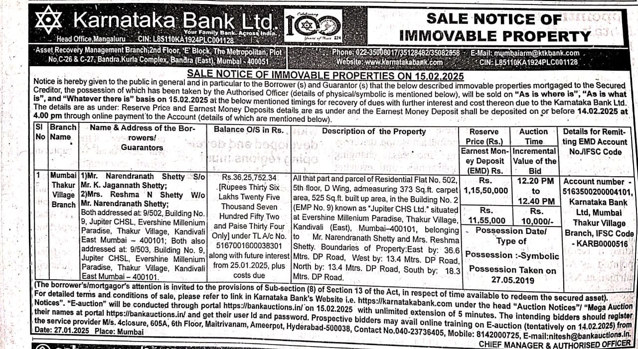 | Schedule of Property: | All that part and parcel of Residential Flat No. 502, 5th floor, D Wing, admeasuring 373 Sq.ft. carpet area, 525 Sq.ft. built up area, in the Building No. 2 (EMP No. 9) known as "Jupiter CHS Ltd." situated at Evershine Millenium Paradise, Thakur Village, Kandivali (East), Mumbai-400101, belonging to Mr. Narendranath Shetty and Mrs. Reshma Shetty. Boundaries of Property:East by: 36.6 est Mtrs. DP Road, West by: 13.4 Mtrs. DP Road, North by: 13.4 Mtrs. DP Road, South by: 18.3 Mtrs. DP Road. |