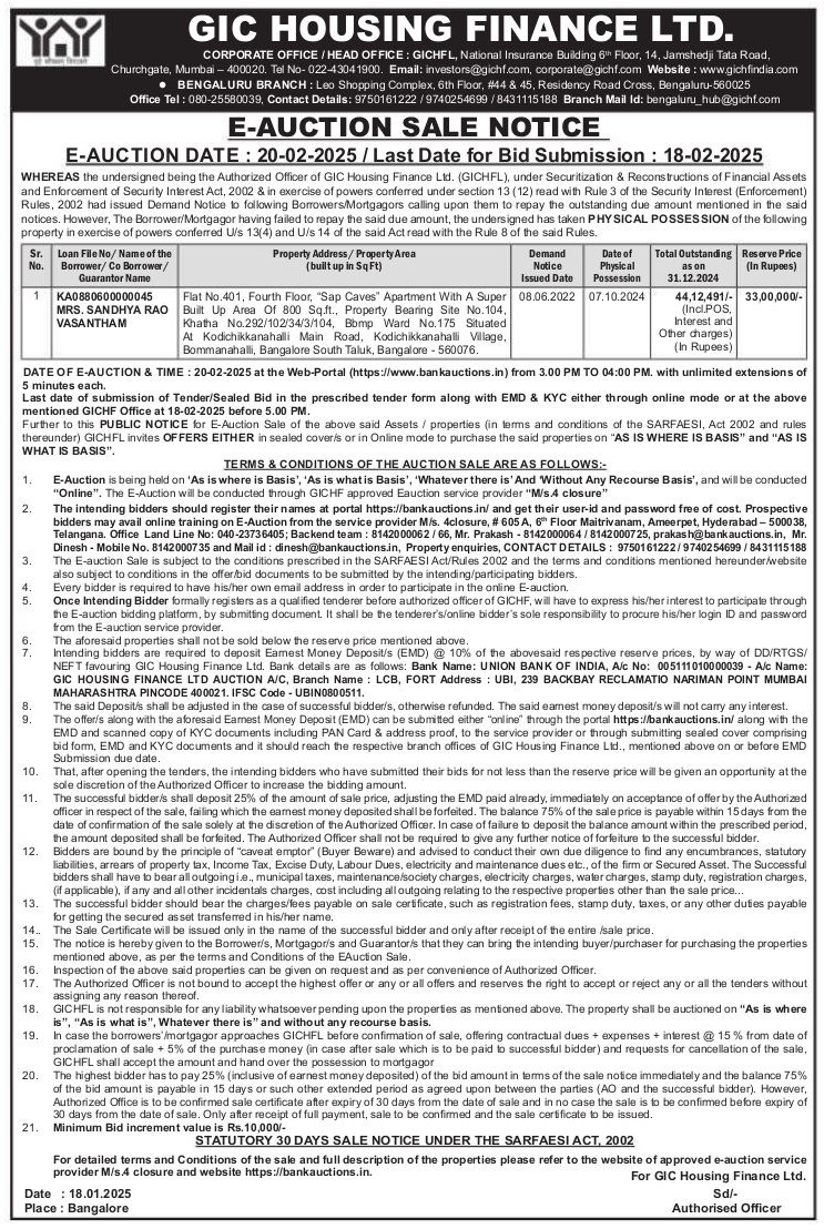 | Contact Details: | Contact the Authorized Officer : Office Tel 080-25580039, Contact Details: 9750161222 / 9740254699 / 8431115188, Branch Mail Id: bengaluru_hub@gichf.com |