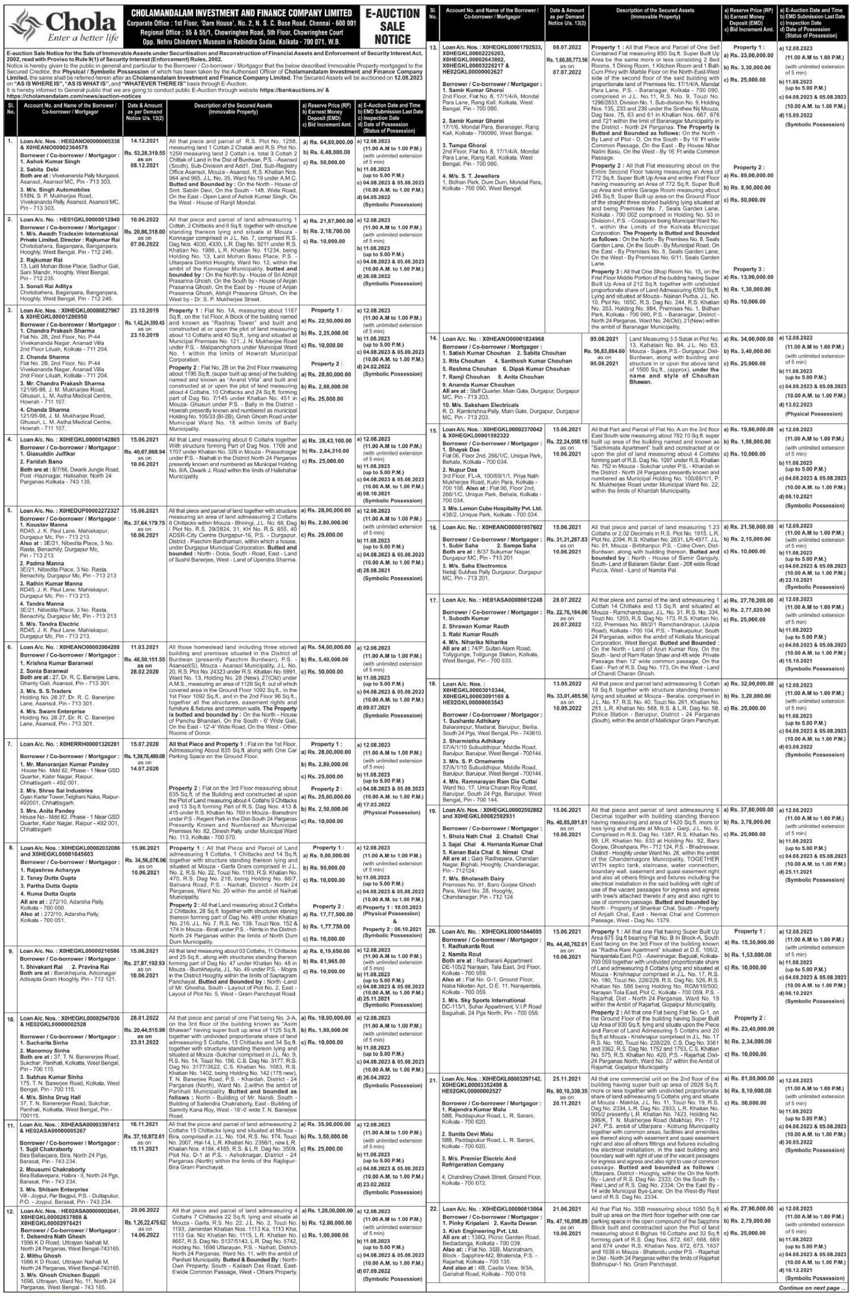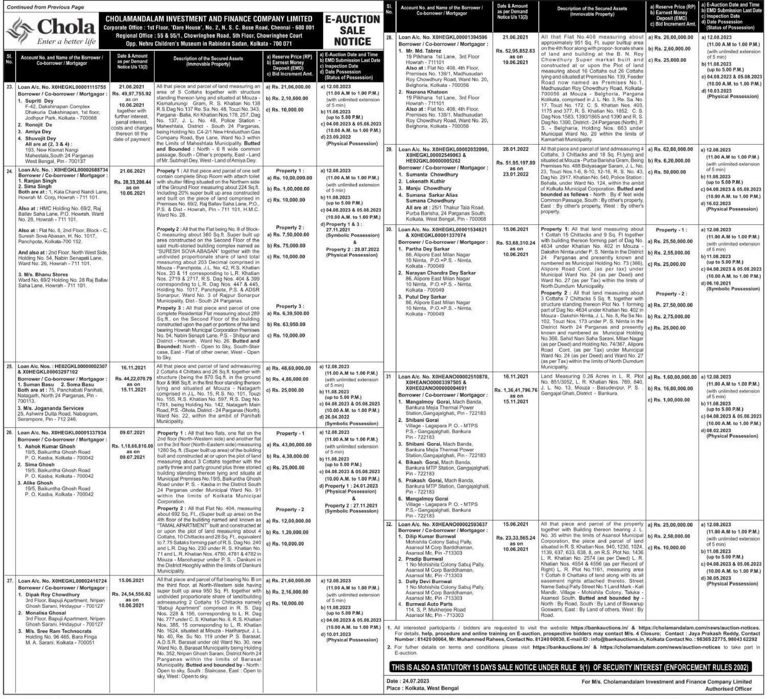 | Contact Details: | Contact the Authorized Officer :Mr. Aditya Bose, Mob. No.9836522775 and Mr. Partha Banik, Mob. No.9830186630. Mr. Muhammed Rahees, Mob No: 8124000030. |