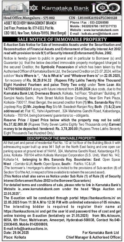 | Start Date and Time of Auction: | 22-05-2025 11:30 am |