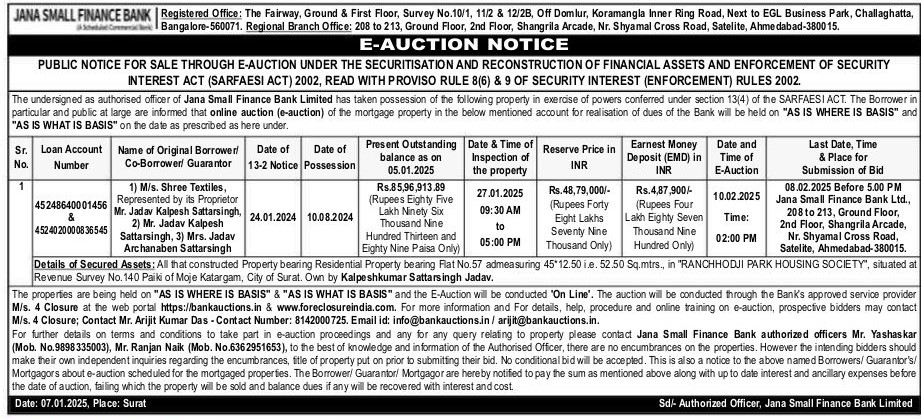 | Schedule of Property: | Details of Secured Assets: All that constructed Property bearing Residential Property bearing Flat No.57 admeasuring 45X12.50 i.e. 52.50 Sq.mtrs. in RANCHHODJI PARK HOUSING SOCIETY, situated at Revenue Survey No. 140 Paiki of Moje Katargam, City of Surat. Own by Kalpeshkumar Sattarsingh Jadav. |