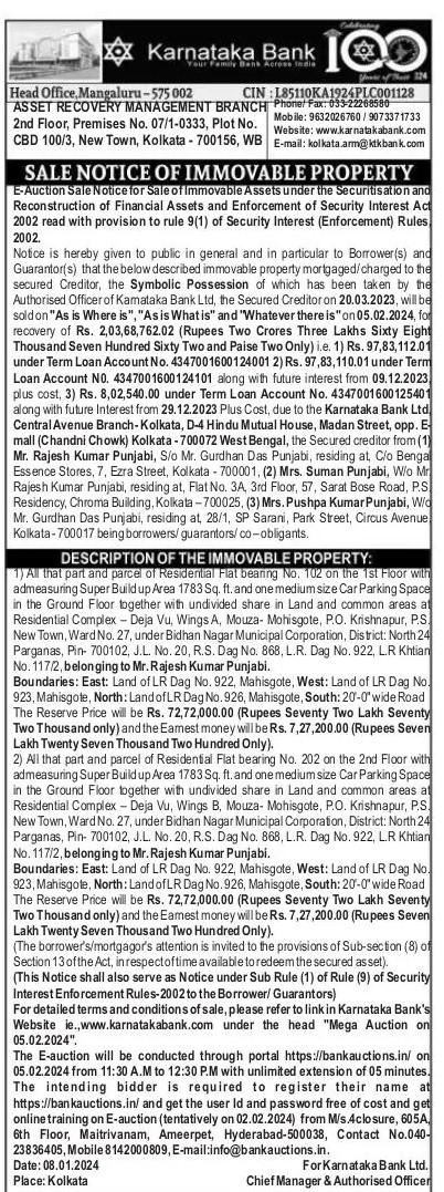 | Schedule of Property: | All that part and parcel of Residential Flat bearing No. 102 on the 1st Floor with admeasuring Super Buildup Area 1783Sq ft. and one medium size Car Parking Space in the Ground Floor together with undivided share in Land and common areas at Residential Complex Deja Vu, Wings A. Mouza- Mohisgote, P.O. Krishnapur, P.S New Town Ward No. 27. under Bidhan Nagar Municipal Corporation, District: North 24 Parganas, Pin- 700102, J.L. No. 20. R.S. Dag No. 868, L.R. Dag No. 922, L.R Khtian No. 117/2 belonging to Mr. Rajesh Kumar Punjabi. Boundaries: East: Land of LR Dag No. 922, Mahisgote, West: Land of LR Dag No 923, Mahisgote, North: Landof Dag No. 926, Mahisgote, South: 20-0 wide Road |