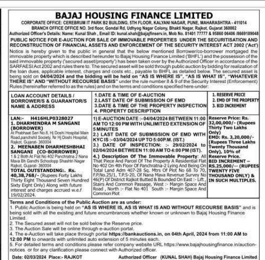 | Contact Details: | Contact The Authorized Officer : Kunal Shah, Email ID: kunal.shah@bajajfinserv.in Mob No. 81401 77777 & 95860 06406 /8669189048 |