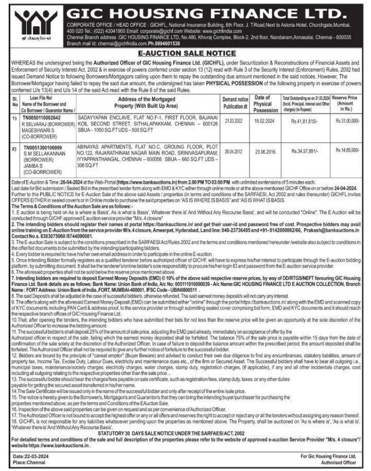 | Inspection Details: | For Inspection : Contact the Authorized Officer : Ph. 9894601538, Branch mail Id: chennai@gichfindia.com |
