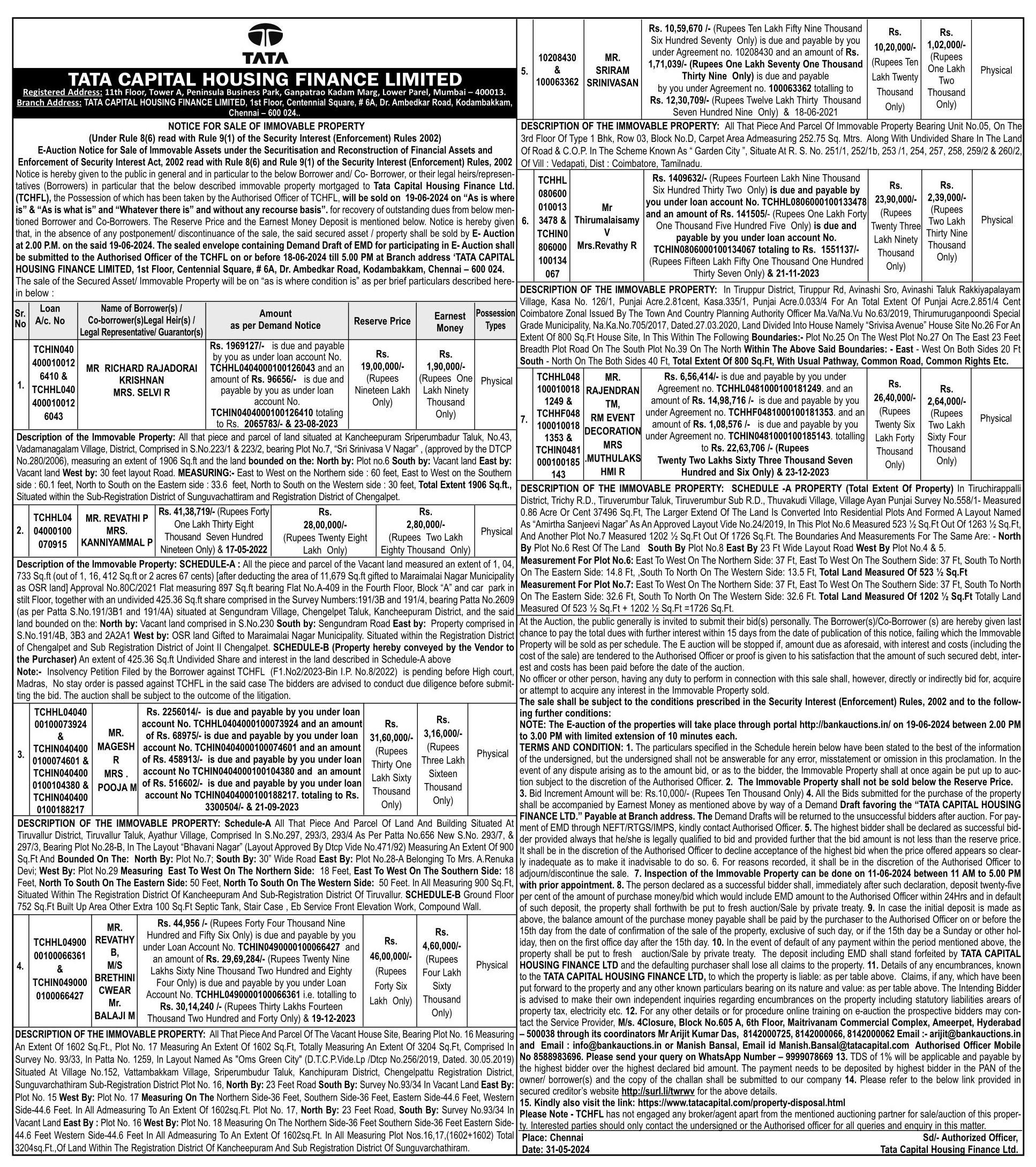 | Contact Details: | Contact the Authorized Officer : Mr. Manish Bansal - 8588983696 / 9999078669, Email:manish.bansal@tatacapital.com |