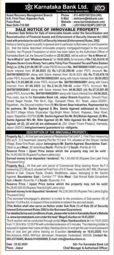 | Schedule of Property: | Property No.1 All that part and parcel of Residential Flat Unit F2 First Floor measuring 950 sq.ft., S S Apartment bearing Plot No 113 and 114. situated at Shri Shyam Vartika Village, Siwar Sirsi Road Jaipur. belonging to Mr. Sachin Agarwal Boundaries: East Other's Land West 30' wide Road North Plot No B-112 South Plot No B-115 |