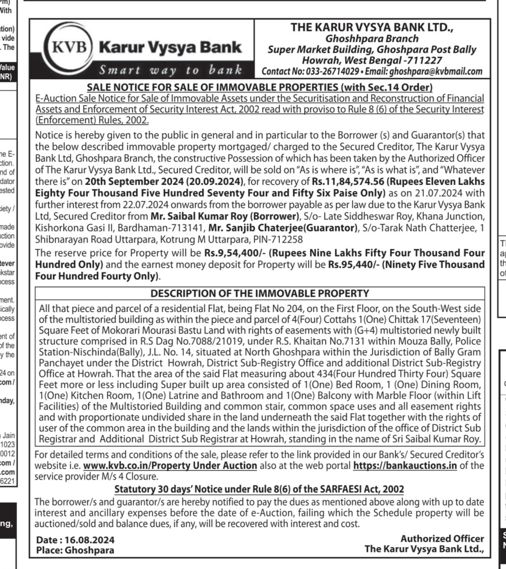 | Contact Details: | Contact The Authorized officer : 033-26714029, Email: ghoshpara@kvbmail.com |