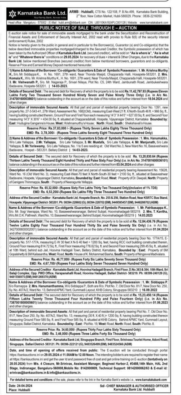 | Schedule of Property: | Description of immovable Secured Assets: All that part and parcel of residential property bearing Door No. 177A/15 E. property No. 517-177A measuring E-W 30 feet XN-S 40 feet is equal to1200 Sq. feet, having RCC roof building constructed therein Ground Floor measuring 814.72 ft. First Floor measuring 776.62 Sq. ft. and Second Floor measuring 299.45 Sq. ft., situated at 10th Ward, behind sub Jail, Hoovina Hadagali Town, Bellary District Karnataka Bounded by East Property of SM Gopalshetty & SM Kailasantha West Road North House of K Mohammad Basha, South: Property of Ningavva Madivalara. |
