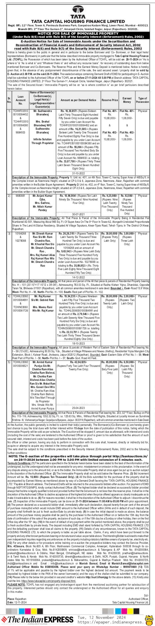 | Contact Details: | Contact The Authorized Officer :Email id manish.bansal@tatacapital.com Mobile No. 8588983696, 9999078669 |