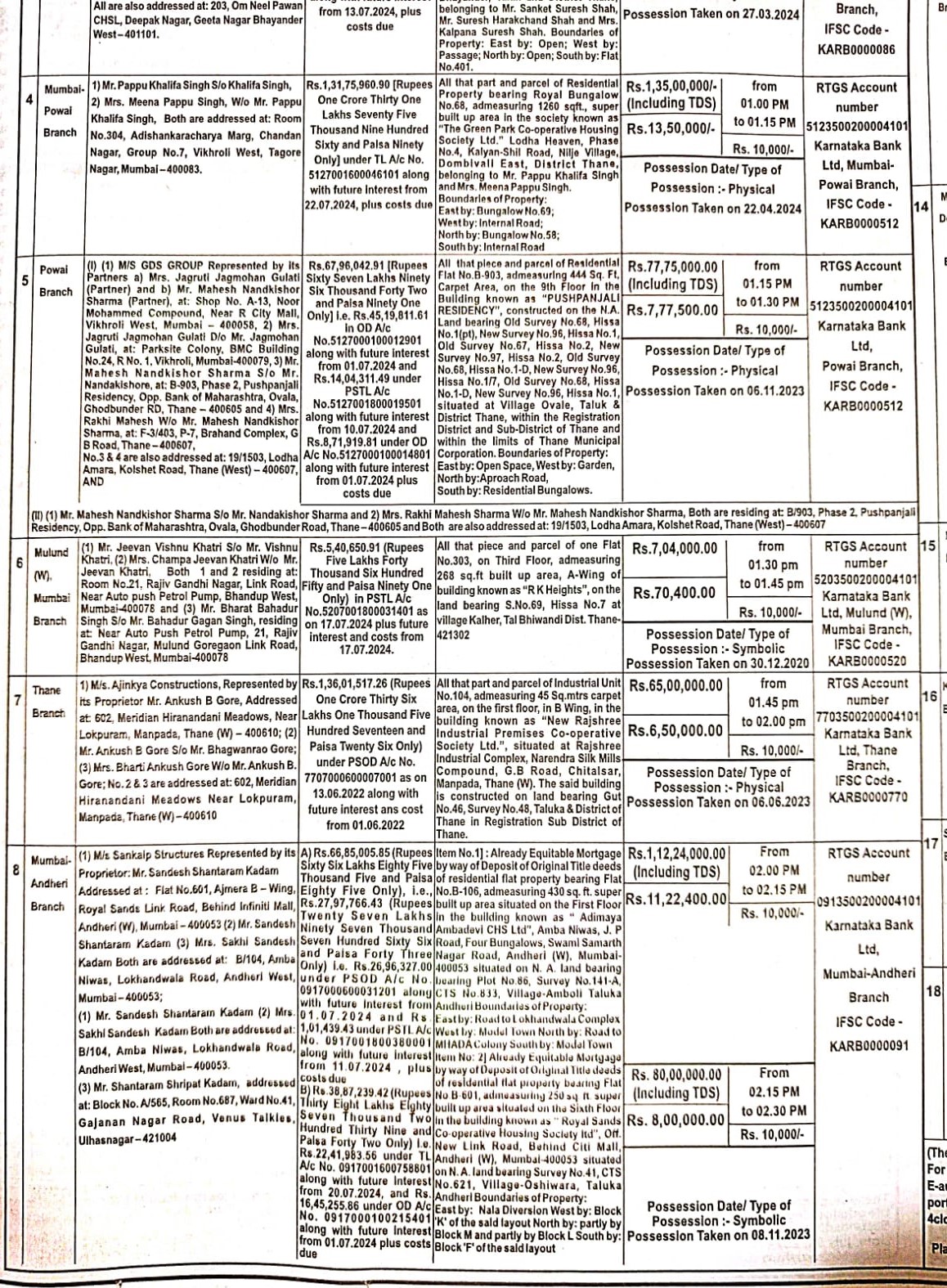 | Inspection Details: | For Inspection : Contact the Authorized Officer : Asset Recovery Management Branch, Ph: 022-35008017 / 35128482 / 35082558 / E-Mail: mumbaiarm@ktkbank.com |