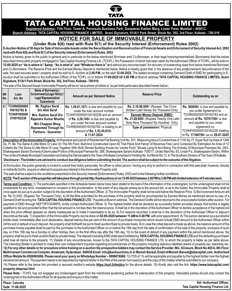 | Schedule of Property: | All that piece and parcel of Residential Flat Bearing Unit No. 501, Measuring About Covered Area of 1130 Sq. Ft. Super Buit Up Area of 1356 Sq. Ft. Be The Same A Little More Or Less On The 5th Floor, Built And Constructed Upon All That Piece And Parcel Of Revenue Free Land Contanied By Estimation An Area of 10 Cottahs Be The Same A Little More Or Less Together With Multi Storied Building Known As "centre Point" Situate Lying At And Being The Entirely Of Municipal Premises No. 28/2, Shakespeare Sarani (formerly A Demrcated Portion of Municipal Premise No. 288, Shakespeare Sarani) Kolkata-700017, Under Ward No. 63, Under P.s. Shakespeare Sarani, Within The Limits of Kolkata Municipal Corporation and being the Demarcated in the Town of Kolkata Comprised In Holding No. 9 of Block No. 12 In The Southern Division of The Town Of Kolkata |