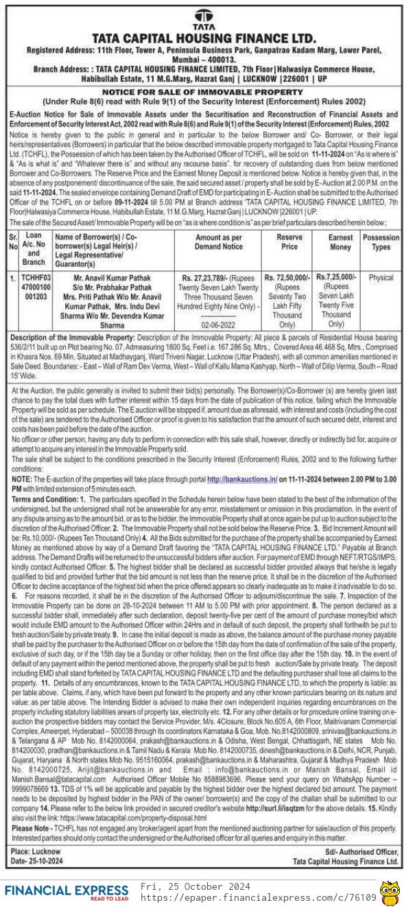 | Contact Details: | Contact The Authorized Officer: Manish Bansal, Email id:bansal@tatacapital.com,8588983696 Please send your query on WhatsApp Number 9999078669 |