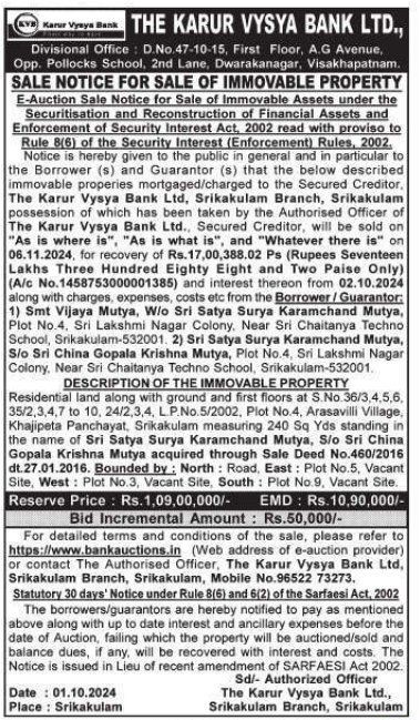 | Schedule of Property: | Residential land along with ground and first floors at S.No.36/3.4.5.6, 35/2,3,4,7 to 10. 24/2,3,4, L.P.No.5/2002. Plot No.4, Arasavilli Village, Khajipeta Panchayat Srikakulam measuring 240 Sq Yds standing in the name of Sri Satya Surya Karamchand Mutya, S/o Sri China Gopala Krishna Mutya acquired through Sale Deed No.460/2016 dt.27.01.2016. Bounded by: North Road, East: Plot No.5, Vacant Site, West: Plot No.3, Vacant Site, South Plot No.9. Vacant Site |