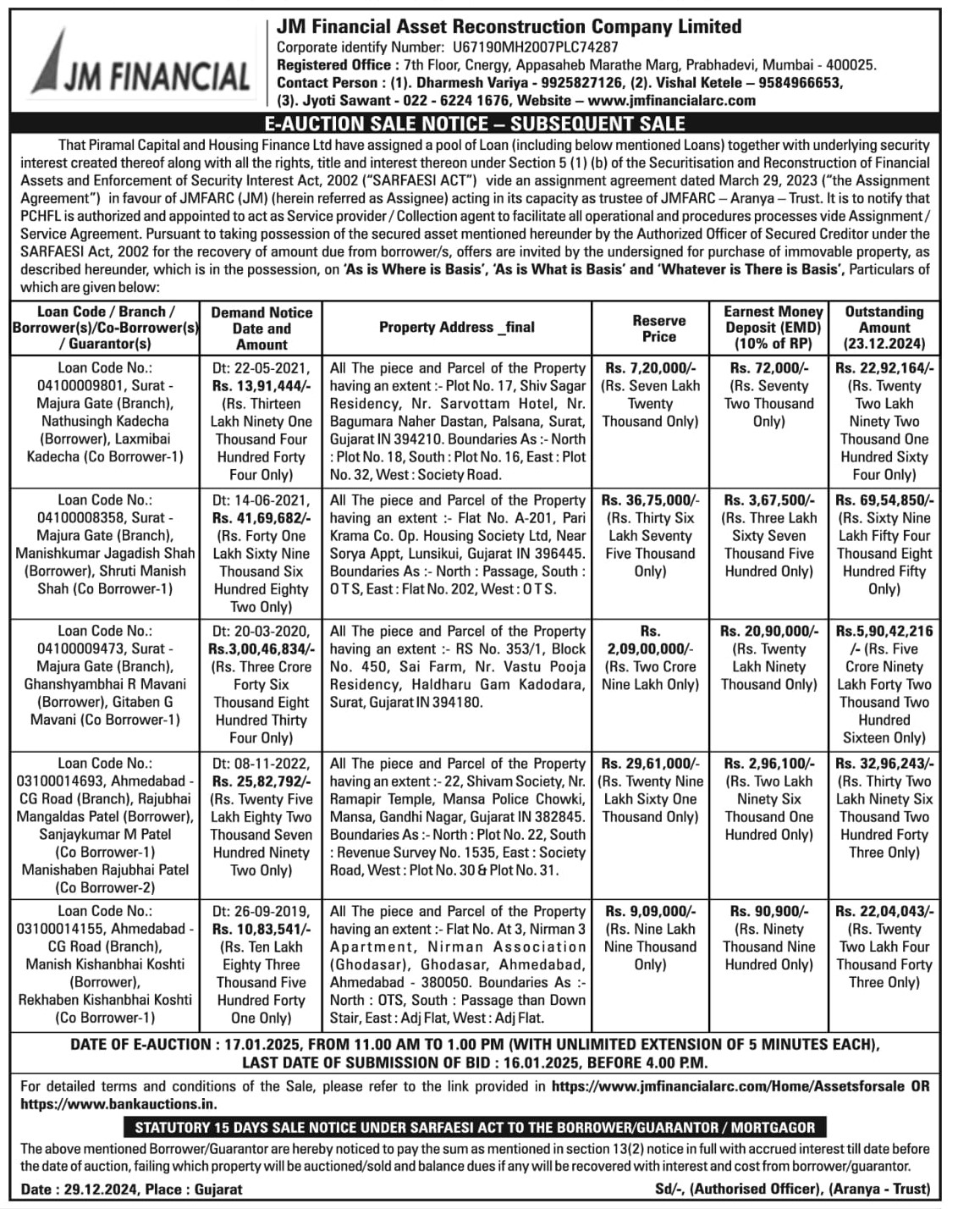 | Contact Details: | Contact The Authorized Officer: Dharmesh Variya - 9925827126, Vishal Ketele - 9584966653, Jyoti Sawant - 022 - 6224 1676 |