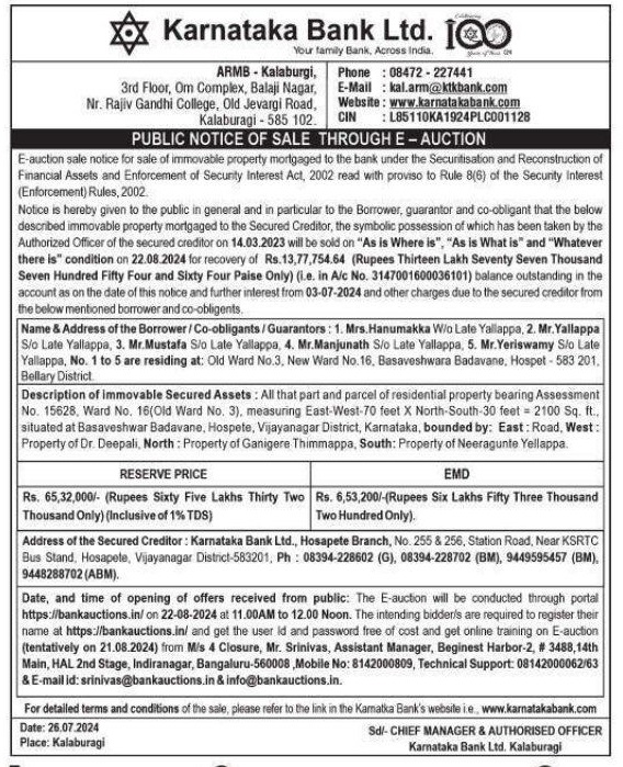 | Schedule of Property: | Description of immovable Secured Assets : All that part and parcel of residential property bearing Assessment No. 15628. Ward No. 16(Old Ward No. 3). measuring East-West-70 feet X North-South-30 feet 2100 Sq. ft., situated at Basaveshwar Badavane, Hospete, Vijayanagar District, Karnataka, bounded by: East : Road, West: Property of Dr. Deepali, North Property of Ganigere Thimmappa South: Property of Neeragunte Yellappa |