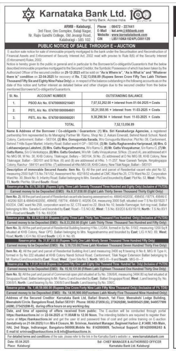 | Inspection Details: | Property Inspection Contact The Authorized Officer : 08392-272856(G), 273620(BM), 9449595425(BM), 9449577999(ABM), 275425(BM-R), 08472-227441 |