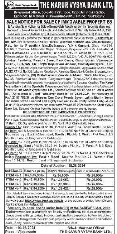 | Schedule of Property: | Residential vacant land Rs Nos 61/4 LP No 36/2017, Chevitikallu Village Grama Panchayat Kanchikacharia Mandal, Krishna district belongs to Mr Koppuravuri Avinash3rd item: 507.6 Sq yards in plot no 13,14.15 in RS No 61/4 of Chevitikallu being Bounded by: East Plot No.22,23,24 South : Plot No 16. West: R & B Road North : Land of Singamsetti Subbarao |