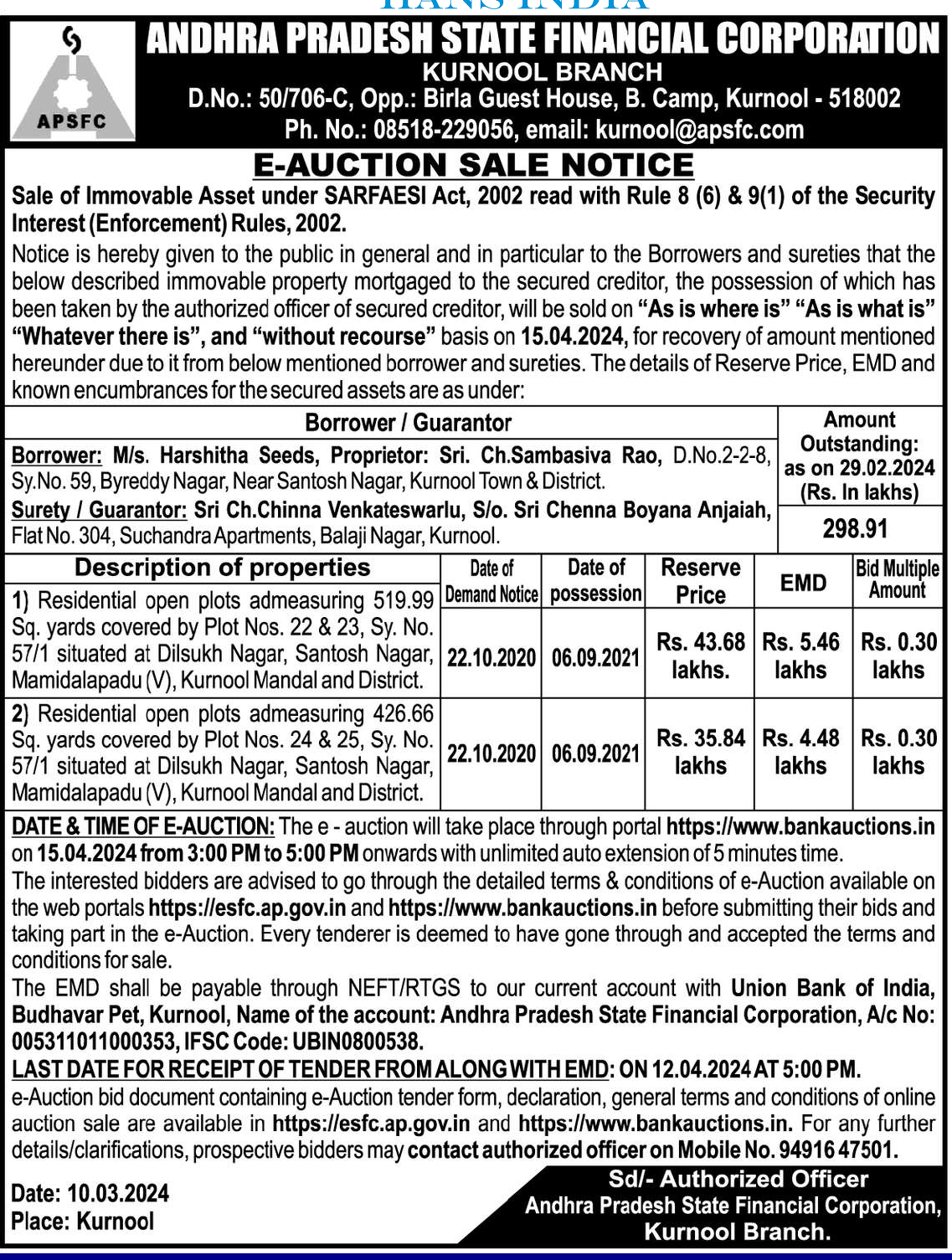 | Schedule of Property: | 2) Residential open plots admeasuring 426.66Sq. yards covered by Plot Nos. 24 & 25, Sy. No. 57/1 situated at Dilsukh Nagar, Santosh Nagar, Mamidalapadu (V), Kurnool Mandal and District. |