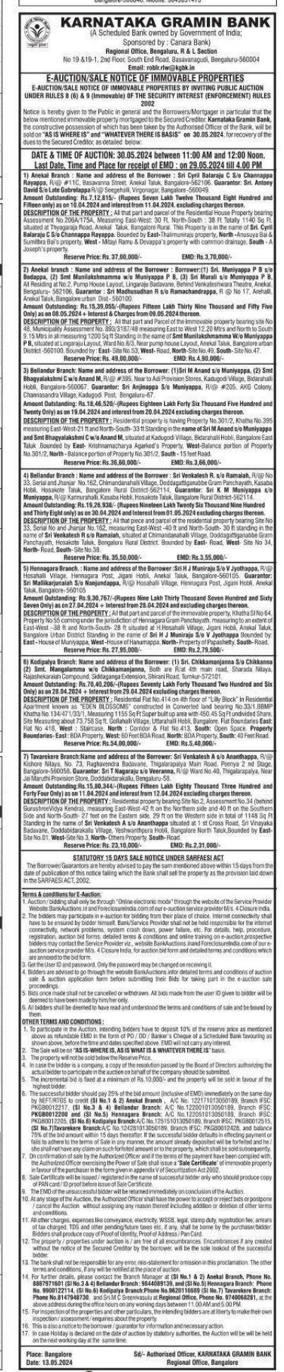| Contact Details: | Contact The Authorized Officer: 8147948730, Sri M C Sreenivasulu 9740068281 |