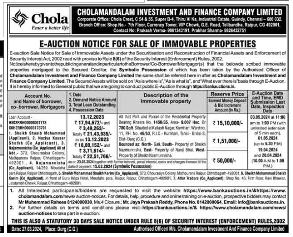| Contact Details: | Contact The Authorized Officer: Prakash Verma- 9981343191, Prakhar Sharma- 9826432751, Mr. Muhammed Rahees Ph No; 8124000030 |