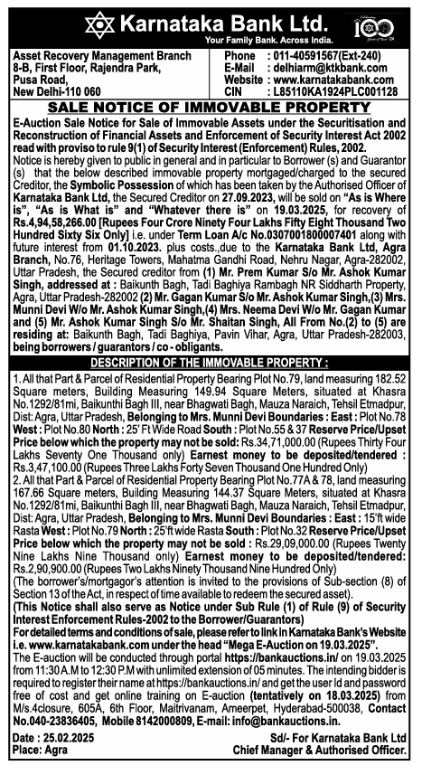 | Schedule of Property: | 1. All that Part & Parcel of Residential Property Bearing Plot No.79, land measuring 182.52 Square meters, Building Measuring 149.94 Square Meters, situated at Khasra No. 1292/81mi, Baikunthi Bagh III, near Bhagwati Bagh, Mauza Naraich, Tehsil Etmadpur, Dist: Agra, Uttar Pradesh, Belonging to Mrs. Munni Devi Boundaries: East: Plot No.78 West: Plot No.80 North: 25' Ft Wide Road South: Plot No.55 & 37 |